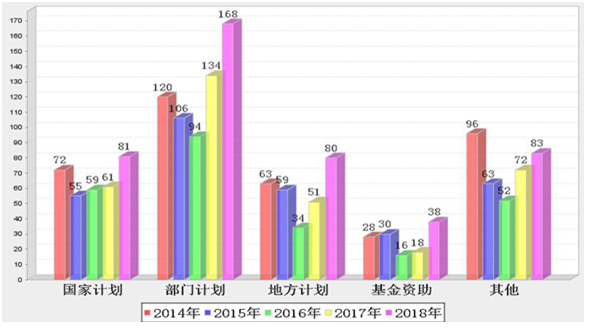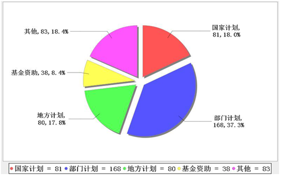 2018年登记的科技成果以部门计划为主,共计168项,占登记总数的37.3%,比2017年增加34项。国家科技计划81项(其中,自然科学基金18项,科技基础性工作专项13项,科技支撑计划8项,科技重大专项7项,高技术研究发展计划5项,国家软科学研究计划4项,国际科技合作专项2项,科研院所技术开发研究专项资金2项,重点基础研究发展计划1项,火炬计划1项,国家重点实验室1项,其他19项)占登记总数的18.0%,比2017年增加20项。地方计划80项,占登记总数的17.8%,比2017年增加29项。基金资助科技成果(除国家基金以外的部门基金、地方基金、民间基金)38项,占登记总数的8.4%,比2017年增加20项。其他科技成果(包括国际合作、横向委托和自选等)83项,占登记总数的18.4%,比2017年增加11项。(见图1-1、1-2)。