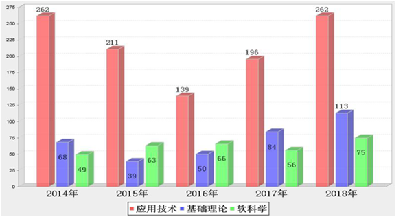 2018年登记科技成果按照成果类别划分可分为应用技术类、软科学类和基础理论类三种,其中,应用技术成果262项,占登记总数的58.2%,比2017年增加66项。基础理论成果113项,占登记总数的25.1%,比2017年增加29项。软科学成果75项,占登记总数的16.7%,比2017年增加19项。(见图1-3)。