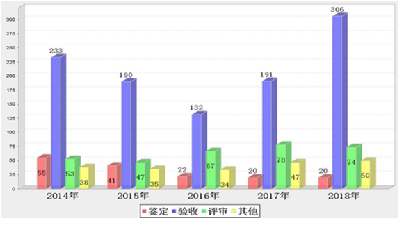 2018年登记的科技成果中,评价方式主要以验收项目为主,共306项,评审项目数74项,鉴定项目数20项,其他评价方式50项。今后,科技成果评价将更多地通过市场来检验,第三方评价等方式将逐步增多(见图1-4)。