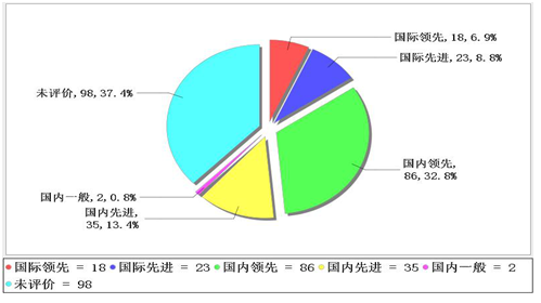 2018年登记的262项应用技术类成果中,水平达到国际领先的成果18项,占6.9%;达到国际先进的成果23项,占8.8%;达到国内领先的成果86项,占32.8%;达到国内先进的成果35项,占13.4%;达到水平一般的成果2项,占0.8%;未评价的成果98项,占37.4%。(见图1-5)。