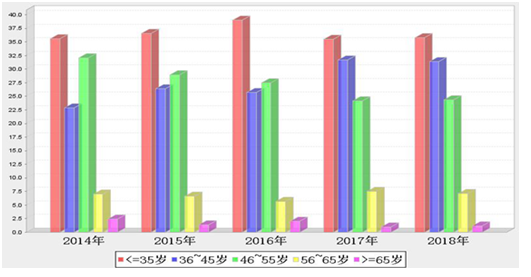 图1-7 2014~2018年科技成果完成人员年龄结构(%)