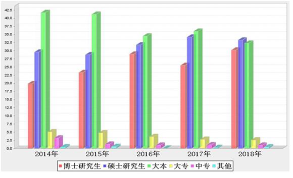 图1-8 2014~2018年科技成果完成人员学历结构(%)