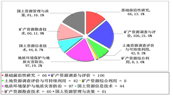 2018年登记的成果按照成果学科领域划分,分为基础前沿性研究成果66项,占登记成果总数的13.1%;矿产资源调查与评价成果106项,占登记成果总数的21.0%;土地资源调查评价与可持续利用42项,占登记成果总数的8.3%;矿产资源综合利用8项,占登记成果总数的1.6%;地质环境保护与地质灾害防治97项,占登记成果总数的19.2%;国土资源信息技术44项,占登记成果总数的8.7%;矿产资源勘查技术60项,占登记成果总数的11.9%;国土资源管理与决策81项,占登记成果总数的16.1%(见图1-6)。