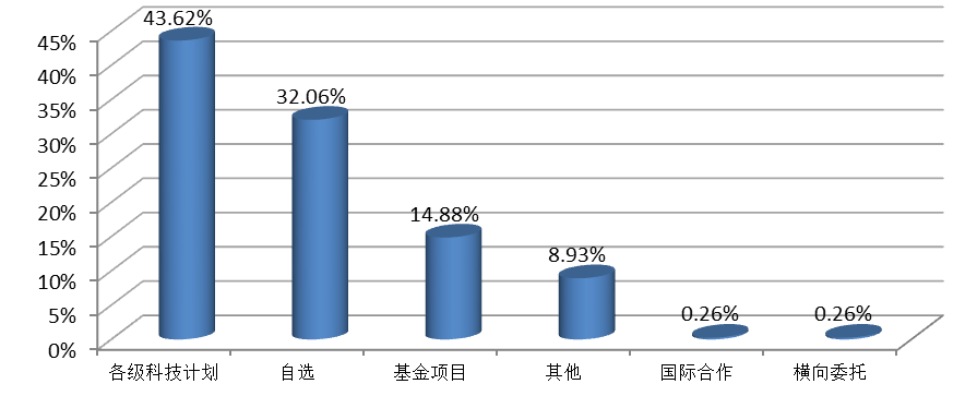 2018年,全省登记的科技成果以各类科技计划项目为主,政府资金起主导作用,其中来源于各类科技计划项目的成果513项,占登记成果总数的43.6%;自选项目377项,占32.1%;基金项目175项,占14.9%;横向委托3项,占0.3%;国际合作3项,占0.3%;其他项目105项,占8.9%。