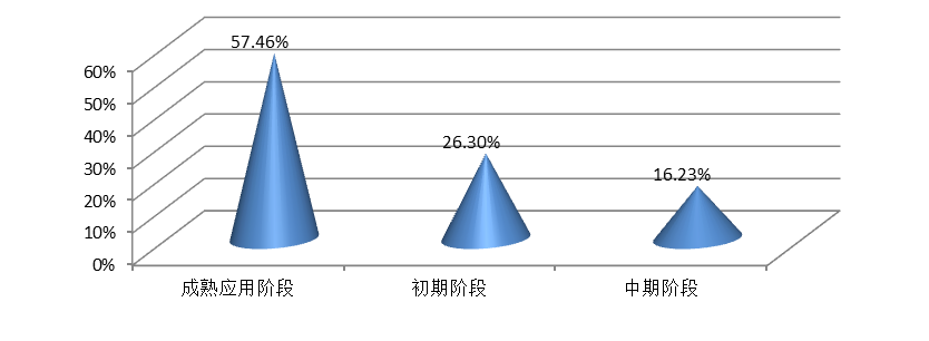 在844项应用技术成果中,485项成果处于成熟应用阶段,占57.5%;222项成果处于初期阶段,占26.3%;137项成果处于中期阶段,占16.2%。