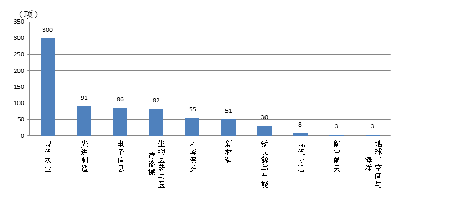 统计数据显示,在844项应用技术成果中,有709项属于高新技术领域,占到应用技术成果八成以上。我省科技成果共涉及10大类高新技术领域,其中现代农业、先进制造、电子信息、生物医药与医疗器械及环境保护五大领域的成果占到了全部高新技术领域的八成以上,特别是现代农业领域达300项,占42.3%。