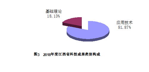 2018年度全省登记的科技成果仍以应用技术成果为主,为569项,与上年相比下降了1.39%,占全年登记成果总数的81.87%;基础理论成果126项,占成果总数的18.13%,与上年相比上升了113.56%;软科学成果0项(见图3)。
