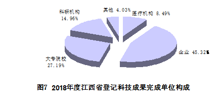 2018年度全省登记的科技成果中,按第一完成单位属性分,企业登记数所占比例最大,共315项,占45.32%;其次是大专院校189项,占27.19%,独立科研机构104项,占14.96%,医疗机构59项,占8.49%,其他单位28项,占4.03%。数据显示,2018年我省科技成果主要分布在企业、大专院校,在成果第一完成单位中所占比例为本年度登记成果完成单位的72.51%,凸显了企业与大专院校在我省科技创新中的主体地位(见图7)。