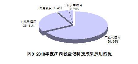 2018年度全省登记的成果中,已应用项目525项,产生了应用效果情况如下:替代落后技术、工艺、装备的项目132项,占应用项目的25.14%;替代进口项目33项,占6.28%;填补国内空白161项,占30.67%;降低成本的项目137项,占26.10%。即应用项目中产生应用效果的占88.19%。