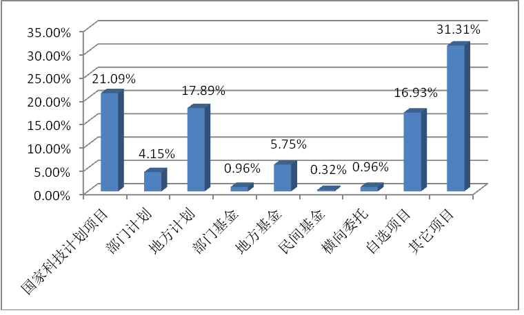 2018年度登记的科技成果中,国家科技计划项目66项,占成果总数的21.09%;部门计划13项,占4.15%;地方计划56项,占17.89%;部门基金3项,占0.96%;地方基金18项,占5.75%;民间基金1项,占0.32%;横向委托3项,占0.96%;自选项目53项,占16.93%;其它项目98项,占31.31%。如图1: