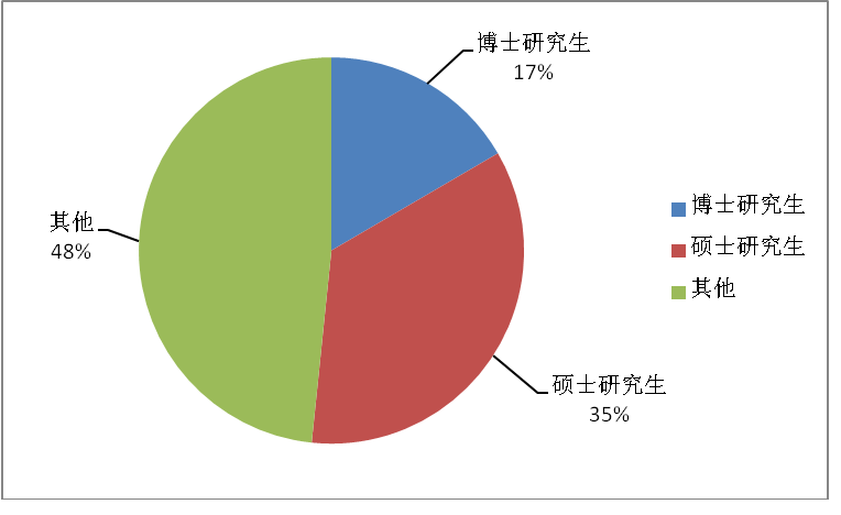 (2)据2018年度登记数据统计,科技成果完成人员中,博士研究生为585人次,占16.59%,硕士研究生为1236人次,占35.04%。其它1706人次,占48.37%。如图4: