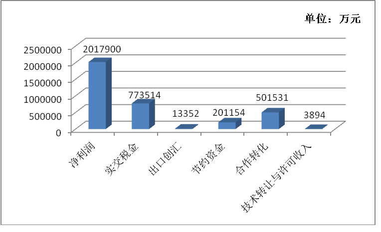 (1)2018年度登记的科技成果累计收入4845720万元。其中,净利润2017900万元,占收入总额的41.64%;实交税金773514万元,占收入总额的15.96%;出口创汇13352万元,占收入总额的0.28%;节约资金201154万元,占收入总额的4.15%;合作转化收入501531万元,占收入总额的10.35%;技术转让与许可收入3894万元,占收入总额0.08%。如图5:
