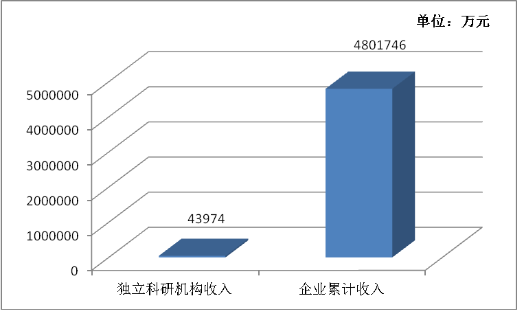 (2)比较2018年度不同属性成果完成单位的登记成果经费累计收入情况,在全部登记科技成果经费收入中,其中企业登记成果的累计收入最高,登记成果累计收入4801746万元,占总收入的99.09%;独立科研机构收入累计收入43974万元,占总收入的0.91%。