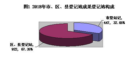2018年重庆市科技成果登记数量1369项。其中,市级登记站登记成果447项,占全市成果登记总数的32.65%;区县成果登记站登记成果922项,占全市成果登记总数的67.35%。见图(1)