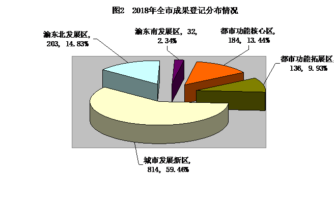 成果登记中区域差异较大,都市功能核心区6个区登记成果共184项,占全市成果登记数量的13.44%;都市功能拓展区3个区登记成果共136项,占全市成果登记数量的9.93%;城市发展新区13个区县登记成果共814项,占全市成果登记数量的59.46%;渝东北生态涵养发展区11个区县登记成果共203项,占全市成果登记数量的14.83%;渝东南生态保护发展区6区县登记成果共32项,占全市成果登记数量的2.34%。见图2