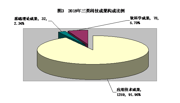 2018年全市登记的科技成果以应用技术为主,共登记应用类成果1259项,同比增加了2.52%,占全年登记成果总数的91.96%;登记基础理论成果32项,同比减少了27.27%,占全年登记成果总数的2.34%;登记软科学成果78项,同比持平,占全年登记成果总数的5.70%。(见图3)