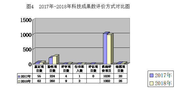 从2018年科技成果的评价方式分析,各种评价方式所占比例与2017年相差不大。其中评价方式排名前三的与去年相同,数量排序依次为机构评价数1002项与去年相比分别减少36项;验收项目数268项,鉴定项目数62项与去年相比约有增加,分别是44项和7项;其次是结题项目数26项,与去年相比减少2项;评审项目数9项和行业准入数2项,与去年相比约有增加,分别增加5项、1项;未见评估项目数与去年相同(见图4)