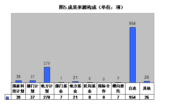 成果来源于国家科技计划39项,(其中,国际科技合作专项10项;科技支撑计划7项;自然科学基金6项;国家软科学研究计划和其他计划各3项;火炬计划、国家工程技术研究中心、科技型中小企业技术创新基金、农业科技成果转化资金各2项;科技重大专项、星火计划各1项;重点基础研究发展计划、高技术研究发展计划、科技基础条件平台建设、国家重点新产品计划、国家重点实验室、重大科学仪器设备开发专项、科技基础性工作专项、国家野外科学研究观测台站、科技富民强县专项行动计划、科研院所技术开发研究专项、ITER计划专项均等均无成果登记),国家计划所占比例为2.85%;部门计划37项,所占比例为2.70%;地方计划270项,所占比例为19.72%;部门基金7项,所占比例为0.51%;地方基金21项,所占比例为1.53%;民间基金8项,所占比例0.58%;横向委托7项,所占比例为0.51%;自选954项,所占比例为69.69%;其它共计26项,所占比例为1.90%。无国际合作立项来源(见图5)