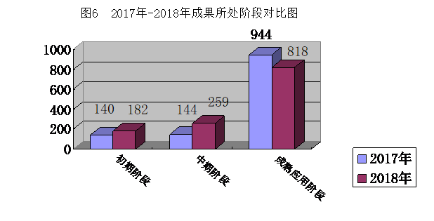 2018年初期阶段成果182项,占14.56%(2017年初期阶段成果140项,占11.40%);中期阶段成果259项,占20.57%(2017年中期阶段成果144项,占11.73%);成熟应用阶段818项,占64.97%(2017年成熟应用阶段944项,占76.87%)。与2017年成果的成熟应用相比下降126项。(见图6)