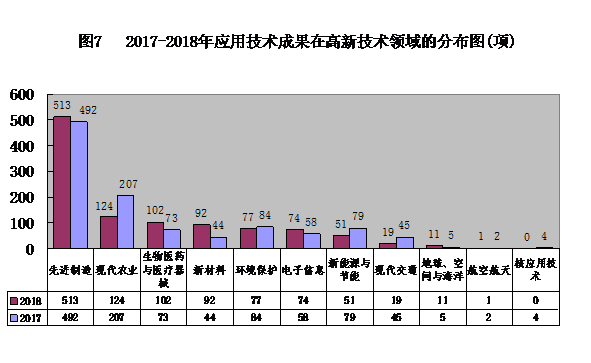从2018年登记的应用成果所属高新技术领域分布来分析,成果数为1064项,占应用技术成果数的84.51%。先进制造成果513项,占40.75%,位居第一;成果数有增加的分别是:生物医药与医疗器械102项,所占比例为8.10%,与去年相比增加29项;新材料92项,所占比例为7.31%,与去年相比成果数增加48项;电子信息74项,占5.88%,与去年相比成果数增加16项;地球、空间与海洋11项,所占比例为0.87%,与去年相比增加6项;其余领域都有所下降,他们分别是:现代农业124项,所占比例为9.85%,与去年相比减少83项;环境保护77项,所占比例为6.12%,与去年相比减少7项;新能源与节能51项,所占比例为4.05%,与去年相比减少28项;现代交通19项,所占比例为1.51%,与去年相比减少26项;航空航天1项,所占比例为0.08%,与去年相比减少1项;今年无核应用技术成果登记。从现有成果统计数据分析,先进制造、生物医药和医疗器械、现代农业、新材料、环境保护、新能源与节能等将继续是我市重点发展的高新技术支柱产业。(见图7)