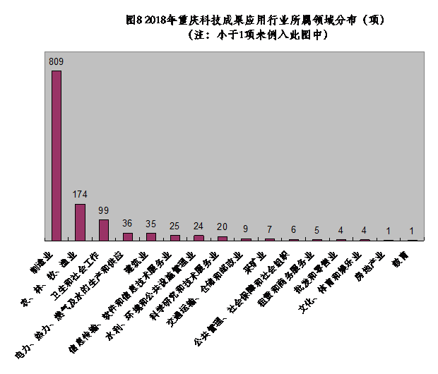 根据成果应用行业分类,2018年登记的应用成果1259项成果中,制造业最高,其成果数为809项,所占比例为64.26%(2017年成果数为744项,所占比例为60.59%);农、林、牧、渔业成果数为174项,所占比例为13.82%;卫生和社会工作99项,所占比例为7.86%;电力、燃气及水的生产和供应业成果数为36项,所占比例为2.86%;建筑业35项,所占比例为2.78%;信息传输、软件和信息技术服务业25项,所占比例为2.00%;水利、环境和公共设施管理业24项,所占比例为1.91%;科学研究和技术服务业成果数20项,所占比例为1.59%;交通运输、仓储和邮政业成果数为9项,所占比例为0.71%;采矿7项,所占比例为0.56%;公共管理、社会保障和社会组织6项,所占比例为0.48%;租赁和商务服务业5项,所占比例为0.40%;批发和零售业和文化体育和娱乐业均为4项,所占比例0.32%;教育和房地产业均为1项,所占比例0.08%;住宿和餐饮业、金融业、居民服务、修理和其他服务业、国际组织均无成果登记。(见图8)