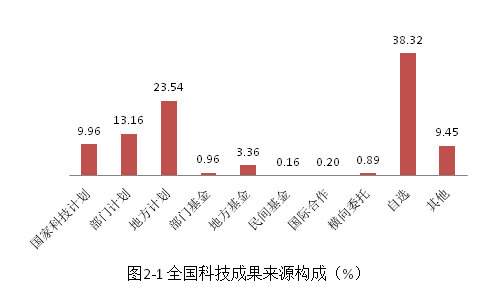 2018年全国登记的科技成果仍以各级财政支持的各类计划项目成果为主。2018年登记的科技成果中,来源于各级科技计划项目的成果30661项,占46.65%;自选项目成果25186项,占有较大的比重,占38.32%。各级科技计划项目中,国家科技计划项目成果占全国科技成果登记总量的9.96%,地方科技计划项目成果占23.54%,部门科技计划项目成果占13.16%(见图2-1)。国家科技计划项目成果中,自然科学基金项目3415项,占登记总量的5.20%;国家科技支撑计划项目624项,占0.95%;科技重大专项项目497项,占0.76%;高技术研究发展计划项目359项,占0.55%。