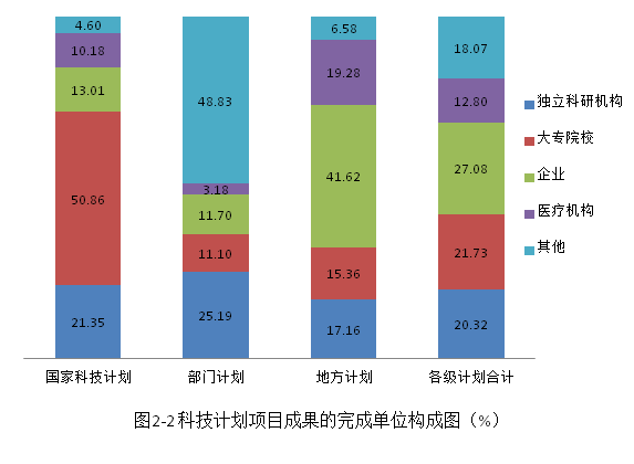 据统计,2018年,各级科技计划项目成果完成单位分布主要集中在企业、大专院校和独立科研机构,其中,企业所占比例最高,达到27.08%,比上年减少3.23个百分点;其次是大专院校,为21.73%;再是独立科研机构,为20.32%。国家计划项目成果中大专院校完成的成果所占比例最高,达到50.86%,比上年增加8.26个百分点。部门计划项目成果中除科研机构、大专院校、企业和医疗机构以外的其它类型单位所占的比例最高,为48.83%;其次是独立科研机构,为25.19%。地方计划项目成果中企业所占的比例最高,比上年增加2.26个百分点达到41.62%;医疗机构、独立科研机构和大专院校的比例分别为19.28%、17.16%和15.36%(见图2-2)。
