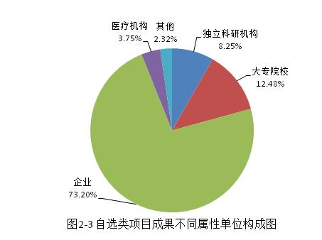自选类项目成果主要来自企业,占73.20%,其次是大专院校(占12.48%)和独立科研机构(占8.25%)(见图2-3)。