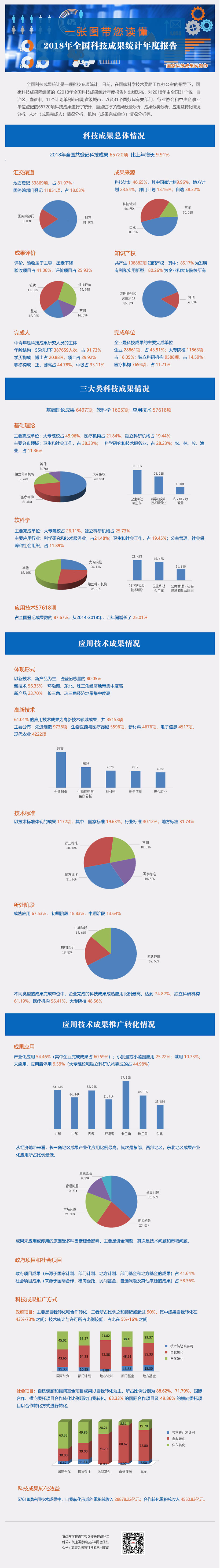全国科技成果统计是一项科技专项统计,日前,在国家科学技术奖励工作办公室的指导下,国家科技成果网编著的《2018年全国科技成果统计年度报告》出版发布,对2018年由全国31个省、自治区、直辖市,11个计划单列市和副省级城市,以及31个国务院有关部门、行业协会和中央企事业单位登记的65720项科技成果进行了统计,重点进行了成果数量分析、成果分类分析、应用及转化情况分析、人才(成果完成人)情况分析、机构(成果完成单位)情况分析等。