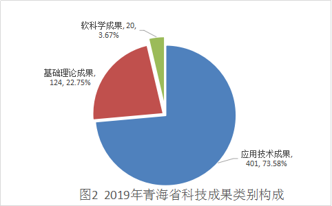 545项科技成果中,如下图2所示,应用技术成果401项,占73.58%;基础理论成果124项,占22.75%;软科学成果20项,占3.67%。