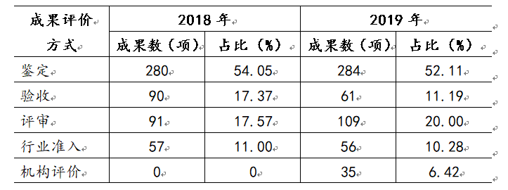如下表1,545项科技成果中,鉴定项目共284项(占52.11%);验收项目61项(占11.19%);评审项目109项(占20.00%);行业准入成果56项(占10.28%),为青海省市场监督管理局发布的地方标准、行业主管部门审定的品种;机构评价成果35项(占6.42%),为授权发明专利。