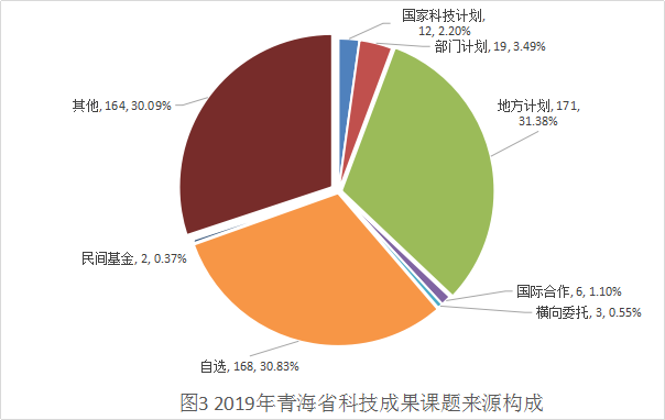 545项科技成果中,国家科技计划12项(自然科学基金9项、科技支撑计划2项、其他1项),占2.20%;部门计划19项,占3.49%;地方计划171项,占31.38%;民间基金2项;自选项目168项,占30.83%;国际合作6项;横向委托3项;其他厅局计划成果164项,占30.09%。(见图3)