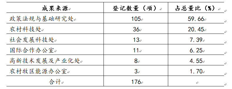其中,省科技厅下达的项目登记成果176项,进一步按照厅处室进行划分,按照成果数量由高到低依次排序为:政策法规与基础研究处105项,农村科技处36项,社会发展科技处13项,国际合作办公室11项,高新技术发展及产业化处8项,农村牧区能源办公室3项。(见表2)