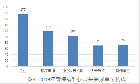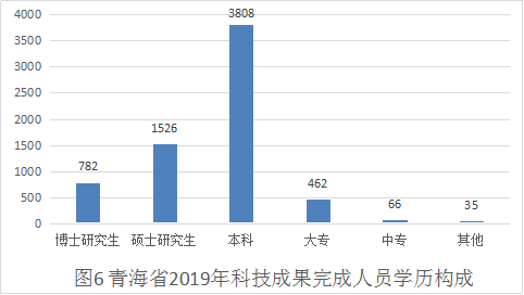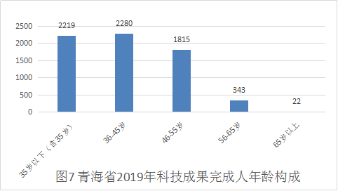 2019年单个科技成果平均完成人员数量、各学历层次人员比例、各年龄段人员比例均与2018年基本相同,与全国2018年情况相比,青海省单个成果12名完成人,全国为6名;青海省博士研究生占比11.71%,全国为20.88%;青海省硕士研究生占比22.85%,全国为29.92%;青海省本科占比57.01%,全国为38.30%;青海省55岁以下人员占比94.54%,全国为91.73%。