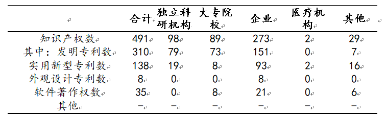 2019年度形成知识产权491件。其中,发明专利达310项,占知识产权数的63.14%;实用新型专利138项,占28.11%;外观设计专利8件,软件著作权35项。(见表4)
