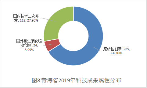 401项应用技术成果中,按照成果属性占比从高到低排列依次为:属于原始性创新的成果过半(占应用技术成果数的66.08%),达到265项;属于国内技术二次开发成果112项,占27.93%;属于国外引进消化吸收创新的成果24项,占5.99%。(见图8)