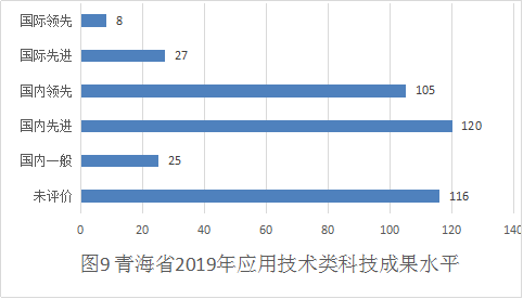 401项应用技术成果中,由图9可见,按照成果水平占比从高到低排列依次为:国内先进水平120项(占29.93%),未评价水平116项(占28.93%),国内领先水平105项(占26.18%),国际先进水平27项(占6.73%),国内一般水平25项(占6.23%),国际领先水平8项(占2.00%)。