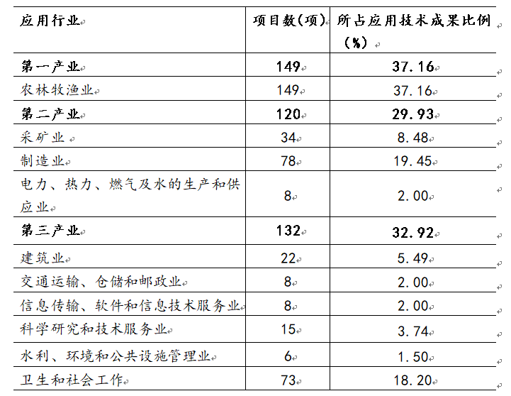 从应用技术成果应用行业分布看,第二产业120项科技成果中,产业化应用64项,占53.33%;第一产业149项科技成果中,产业化应用62项,占41.61%;第三产业132项科技成果中,产业化应用49项,占37.21%。