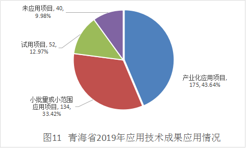 401项应用技术成果中,产业化应用成果175项,占应用技术成果总数的43.64%;小批量或小范围应用成果134项,占33.42%;正在试用的成果52项,占12.97%,未应用的成果40项,占9.98%;。(见图11)