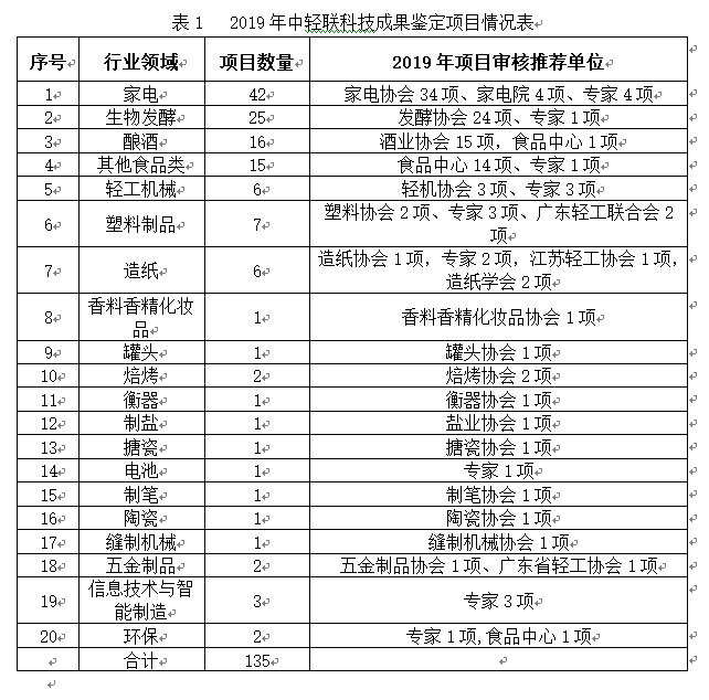 2019年中轻联科技成果鉴定项目135项,涉及领域20个。从推荐渠道上看,由行业协学会(中心)审核推荐项目109项、地方行业组织审核推荐项目3项、专家审核推荐项目19项,研究院所审核推荐4项。从申报主体上看,企业单独申报项目56项、高等院校单独申报项目8项、科研院所单独申报项目1项、产学研联合申报项目70项。通过成果鉴定的形式,对成果的创新性、先进性和成熟性进行评价,一方面可以使完成单位意识到不足,进一步完善改进;另一方面可以对科技成果转化和应用起到积极的推动作用。