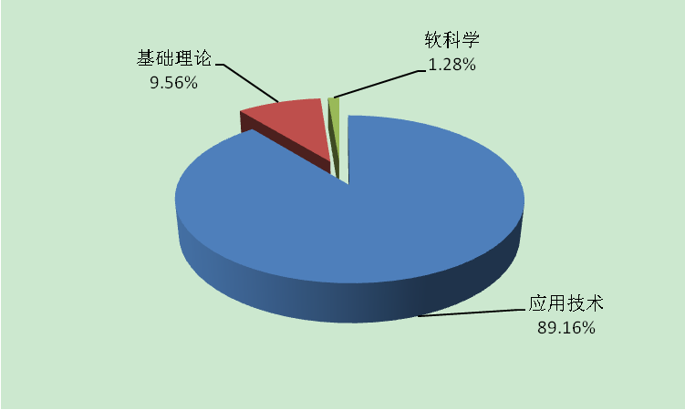 2019年度河南省共登记科技成果1956项,其中应用技术类成果1744项,占全部成果的89.16%;基础理论类成果187项,占全部成果的9.56%;软科学类成果25项,占全部成果的1.28%。