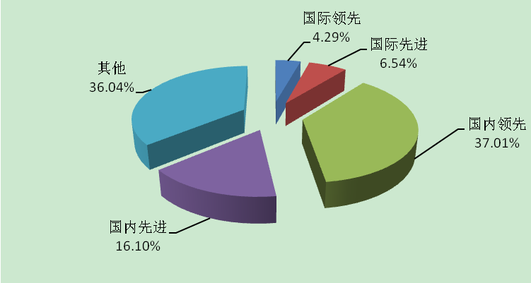 2019年度河南省登记的1956项科技成果中,达到国际领先水平的项目84项,占全部成果的4.29%,;达到国际先进水平的项目128项,占全部成果的6.54%;达到国内领先水平的项目724项,占全部成果的37.01%;达到国内先进水平的项目315项,占全部成果的16.10%,其他项目共705项,占全部成果的36.04%。