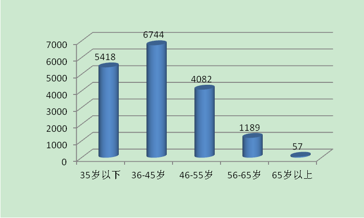 项目完成人中35岁以下人员5418人,占30.98%;36-45岁人员6744人,占38.56%;46-55岁人员4082人,占23.29%;56-65岁人员1189人,占6.80%;65岁以上人员57人,占0.33%。