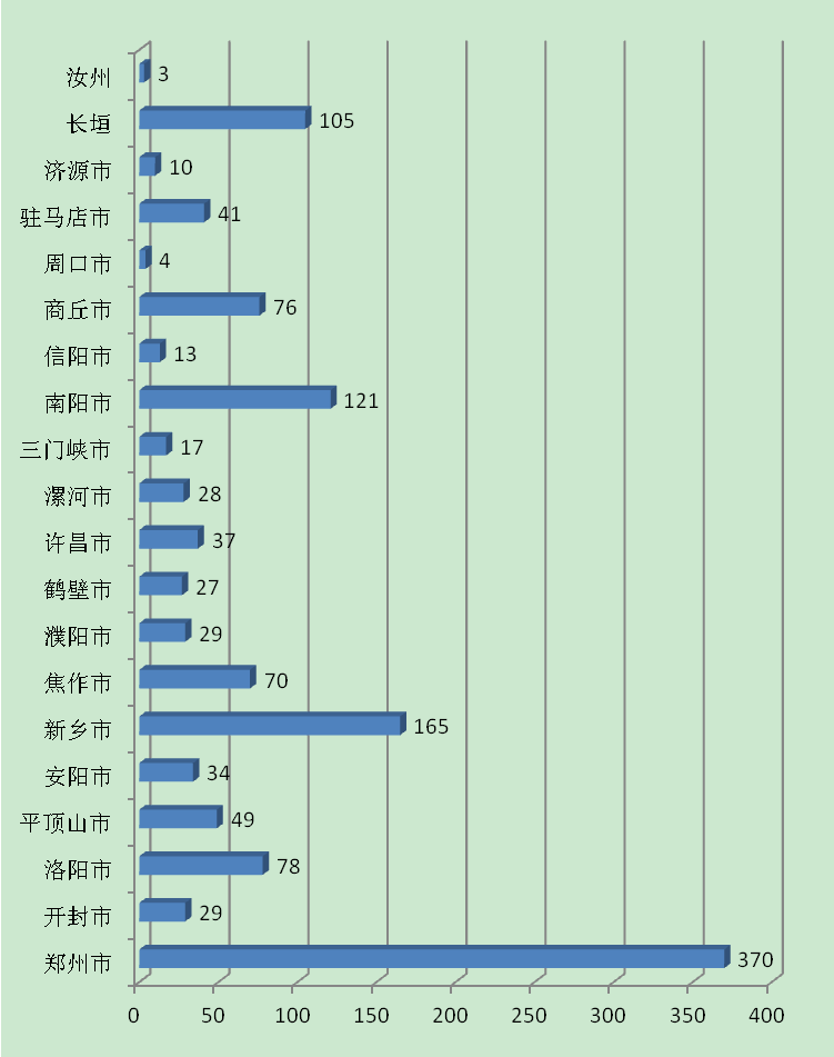 2019年省辖市推荐登记的1198项成果中,郑州市370项,占18.92%;新乡市165项,占8.44%;洛阳市78项,占3.99%;安阳市34项,占1.74%;濮阳市29项,占1.48%;开封市29项,占1.48%;南阳市121项,占6.19%;焦作市70项,占3.58%;驻马店市41项,占2.10%;信阳市13项,占0.66%;平顶山市49项,占2.51%;许昌市37项,占1.89%;商丘市76项,占3.89%;鹤壁市27项,占1.38%;济源市10项,占0.51%;漯河市28项,占1.43%;三门峡市17项,占0.87%;周口市4项,占0.20%;长垣县105项,占5.37%;汝州市3项,占0.15%;巩义市9项,占0.46%。