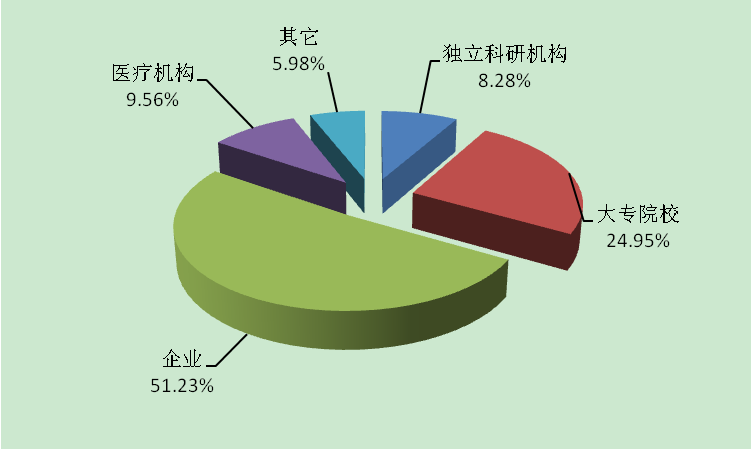2019年度河南省登记的1956项成果中,独立科研机构完成的162项,占8.28%;大专院校完成的488项,占24.95%;企业完成的1002项,占51.23%;医疗机构完成的187项,占9.56%;其他性质单位完成的117项,占5.98%。