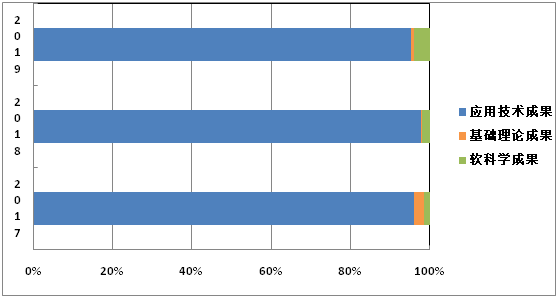 2019年的科技成果中列入国家计划的成果有25项,占登记总成果数的3.07%,其中科技重大专项2项,重点基础研究发展计划(973计划)2项,自然科学基金1项,科技支撑计划1项,软科学研究计划1项,其他18项;列入部门计划的成果为19项,占总成果的2.33%;列入地方计划的成果为64项,占总成果的7.86%;部门基金、地方基金及民间基金8项,占总成果的0.98%;自选项目、横向委托项目及其他项目698项,占总成果的85.75%(见图4、表4)。计划项目(国家计划、部门计划、地方计划、部门基金、地方基金)与自选、横向委托及其他项目之比为14.25:85.75。自选项目成果所占比例逐年提高,为我省成果主要来源,从2017年所占59.52%增加至2019年的85.75%。
