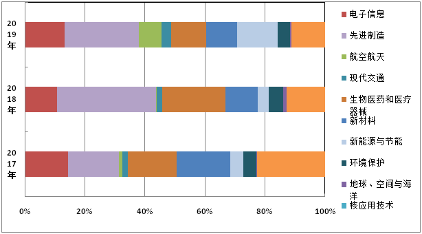 对2019年度应用技术成果的技术领域进行统计:属高新技术领域的应用技术成果共计605项,其中先进制造业150项,比2018年下降了8.12个百分点;新能源与节能82项,比2018年增加9.73个百分点;电子信息业79项,较2018年增加了2.33个百分点;生物医药和医疗器械71项,较2018年下降了9.17个百分点;现代农业68项;新材料63项;航空航天46项;环境保护24项;现代交通19项;地球、空间与海洋3项;(见图15、表14)。可以看出我省先进制造、新能源与节能、电子信息业、生物医药和医疗器械、现代农业、新材料的高新科技成果占据大部分,总占比为84.79%。