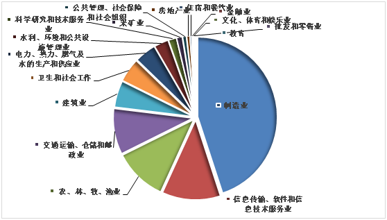 2019年湖南省登记的776项应用技术科技应用行业:制造业349项,信息传输、计算机服务和软件业92项,农、林、牧、渔业84项,交通运输、仓储和邮政业72项,建筑业42项,卫生和社会工作38项,电力、燃气及水的生产和供应业34项,水利、环境和公共设施管理业23项,科学研究与技术服务业13项,采矿业9项,公共管理、社会保障和社会组织6项,房地产业5项,住宿和餐饮业3项,金融业2项,文化、体育和娱乐业2项,批发和零售业1项,教育1项(见图16)。
