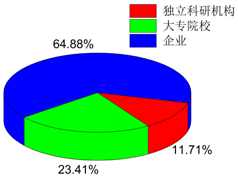 2019年,中国有色金属工业协会共登记来自81个单位的213项应用类科技成果,其中独立科研机构、大专院校、企业分别登记24项、48项、133项。从单位类型来看,成果产出以企业为主体,占比达64.88%(图1);从第一完成单位登记数量来看,登记科技成果较多的单位分别为中国铝业集团有限公司37项、北京矿冶科技集团有限公司17项、广东省科学院14项、有研科技集团有限公司13项、嘉兴学院7项、重庆科技学院7项、中南大学6项、昆明理工大学6项,8家单位登记数量占比总数超过50%。