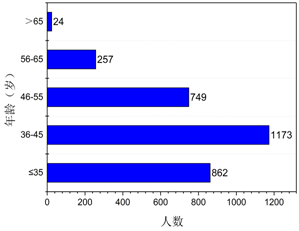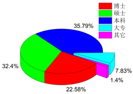 2019年登记的科技成果涉及完成人共3065人,平均每个项目有约14个人参与。如图2所示,36-45岁的中青年为主要科研力量,共1173人,占比总人数的38.27%;小于35岁(含35岁)的成果完成人为862人,占比总人数的28.12%;46-55岁的成果完成人为749人,占比总人数的24.37%。从学历构成看(图3),博士研究生、硕士研究生和本科学历占比最高,分别为35.79%、32.4%和22.58%,本科及以上学历人员占比达90.77%。从职称构成看(图4),中级从业科技人员占比最高,为33.41%,这与科技从业人员中青年人群占比较高有关;正高级人员占比20.98%,副高级人员占比29.66%,高级职称人员占比完成人总数的50.64%;院士占比最小,为0.2%(6人)。